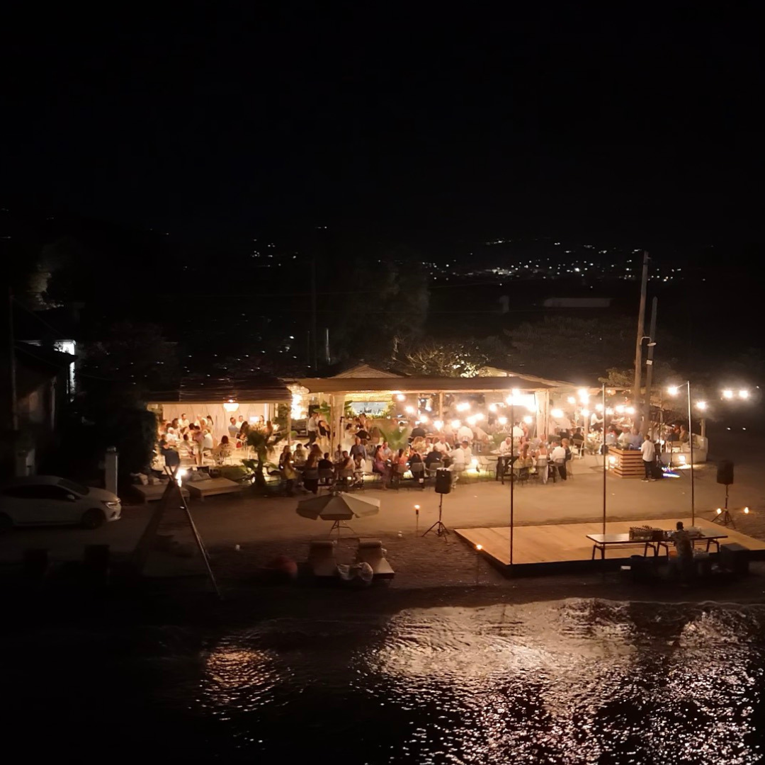 Οι επισκέπτες χαλαρώνουν σε ρομαντικές γωνιές δίπλα στο κύμα, με μουσική, αναμμένα φαναράκια και τη δροσιά του Κορινθιακού να συνοδεύει τις στιγμές τους.